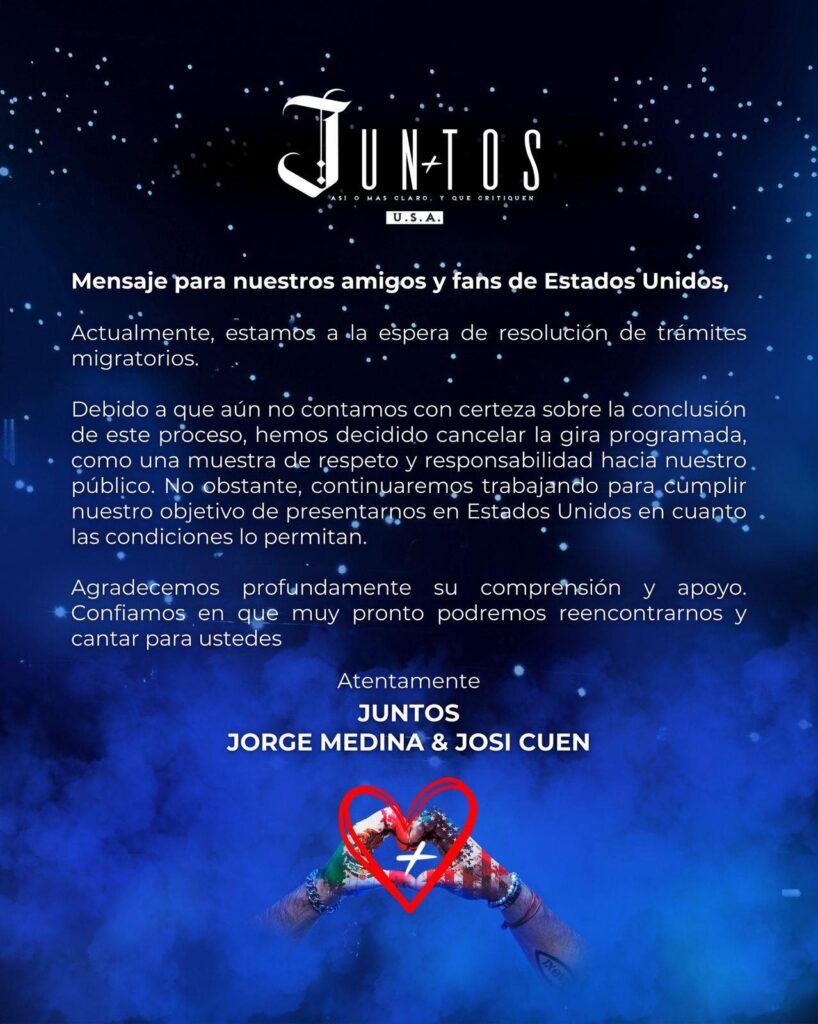 “Actualmente estamos a la espera de la resolución de trámites migratorios. Debido a que aún no contamos con certeza sobre la conclusión de este proceso, hemos decidido cancelar las fechas como una muestra de respeto y responsabilidad hacia nuestro público. No obstante, continuaremos trabajando para cumplir nuestro objetivo de presentarnos en Estados Unidos en cuanto las condiciones lo permitan”, dice parte del comunicado.